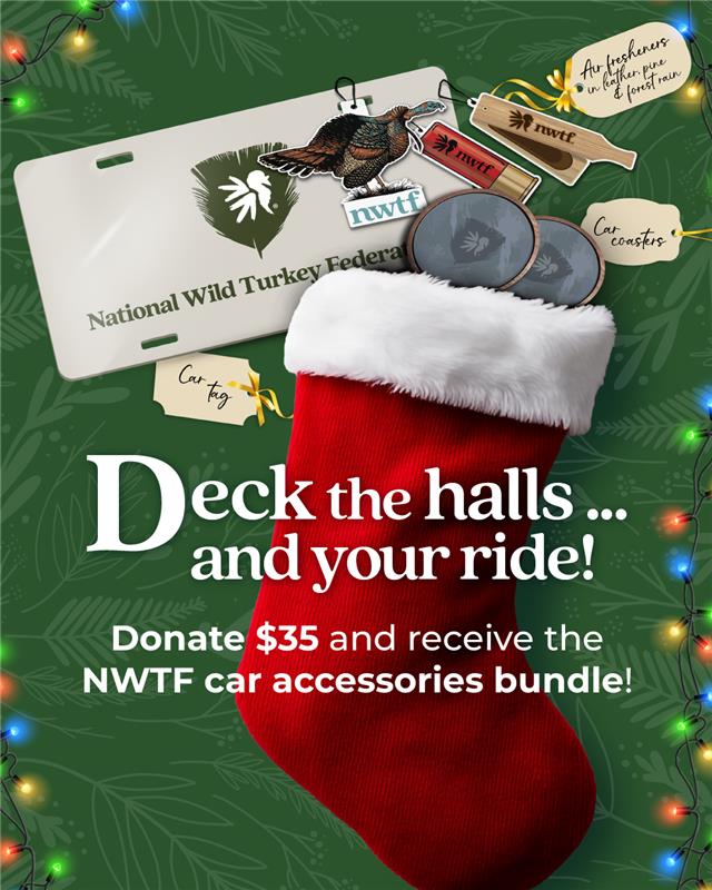 Deck the halls and your ride this season with the NWTF Car Accessories Bundle. The bundle includes a three-pack of NWTF custom air fresheners featured in multiple scents, including pine, forest rain and leather. The bundle also includes a two-pack of car coasters and an NWTF car tag. This bundle is perfect for gifting or treating yourself this holiday season. Donate $35 or more to the NWTF and receive the exclusive car accessories bundle. Your contribution will help to fund critical conservation initiatives throughout the United States while ensuring we have Healthy Habitats. Healthy Harvests. for generations to come.