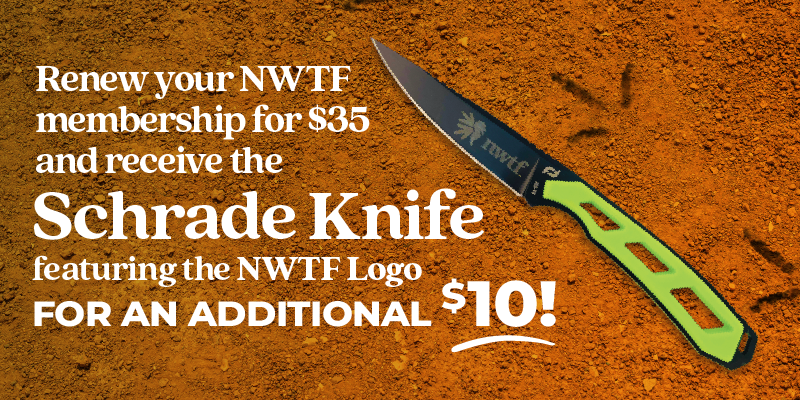 Support the National Wild Turkey Federation’s mission to conserve the wild turkey and preserve our hunting heritage for future generations. Your contribution fuels meaningful work on behalf of turkey hunters, from restoring wild turkey habitat and expanding access to growing our hunting community through R3 and outreach efforts. Join today and with an additional donation of $10 you will receive an NWTF-branded Schrade Knife along with all other member benefits. By joining the National Wild Turkey Federation, you will be doing your part in conserving the wild turkey and preserving our hunting heritage.