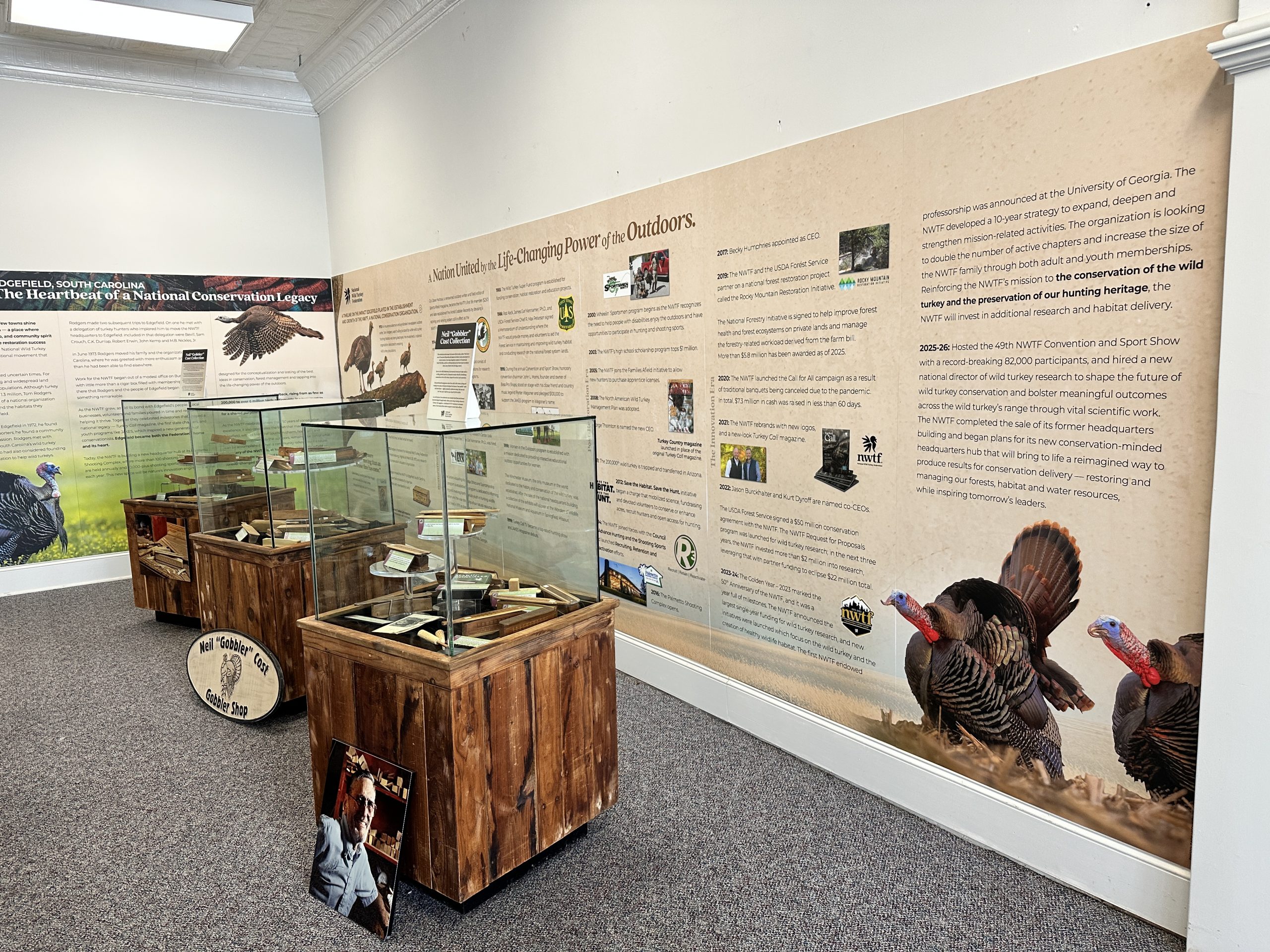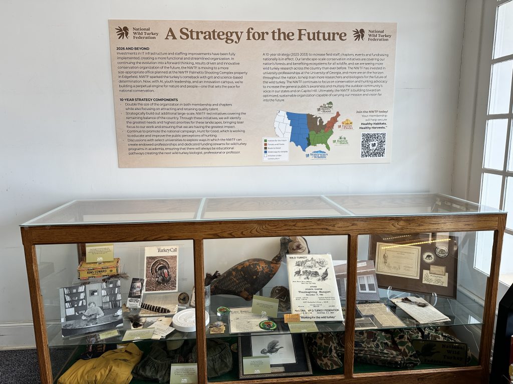 The exhibit highlights Edgefield’s pivotal role in shaping the future of the NWTF and honors the people, partnerships and milestones that have defined the organization’s mission since its founding. Through a detailed timeline, visitors can follow the NWTF’s growth from a small group of dedicated conservationists to a nationwide leader in wildlife habitat conservation and the preservation of hunting heritage.