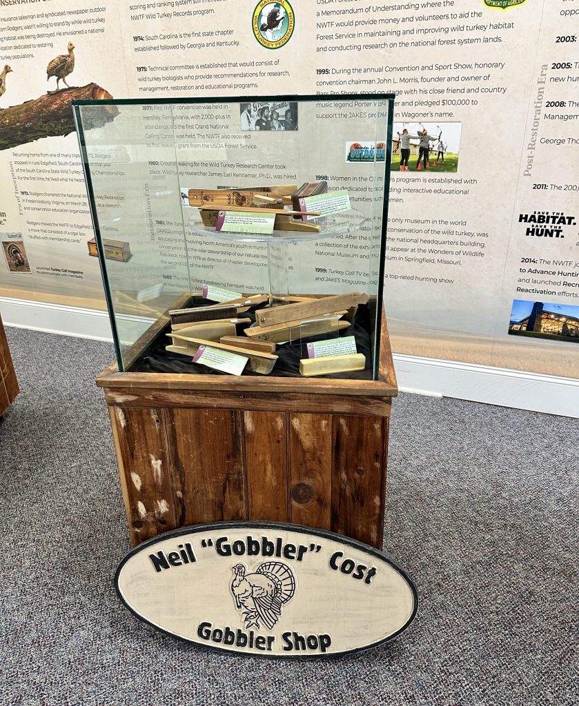 A centerpiece of the exhibit includes handcrafted turkey calls from master call maker Neil Cost, showcasing the craftsmanship and tradition deeply rooted in turkey hunting culture. The display also features wild-turkey-themed American folk art, historic NWTF items and interpretive elements that connect visitors to both the organization’s legacy and its future.