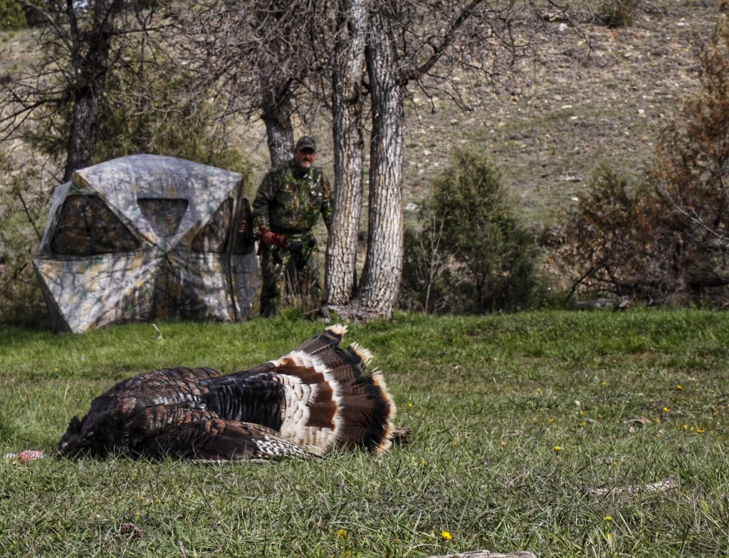 As your notes begin to piece together a pattern, prepare to stake a blind or build a hide in an area that sees consistent turkey visits instead of near an estimated roost site where a turkey can fly down and go in any number of different directions with his harem. Although turkeys do not shy from newly staked pop-up style ground blinds like a whitetail, it never hurts to get them accustomed to the extra landscaping. Follow a similar program to craft a hide from native materials. Pulling together downed logs and adding a curtain of leafy limbs or conifer boughs as your shield ahead of time saves you from potentially bumping a turkey while doing it on the run.