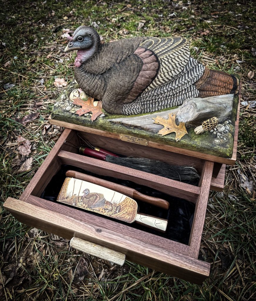 And although the rules state there must not be an actual turkey call in the work of art, Tim built a working hen-box turkey call and placed it inside the beard box — after the competition judging was complete — as a special surprise bonus for the auction.