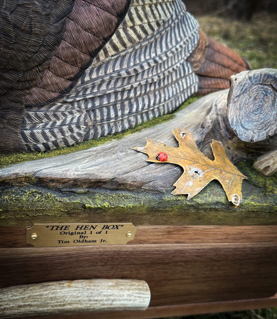 This art piece was a new challenge for Oldham, building a functional piece of furniture by hand while incorporating ultra-detailed carved and painted features. The art showcased several elements of nature, including a last-minute ladybug to add a bit more color to the overall piece. That addition fit the theme well, as ladybugs can symbolize protection, such as a mother hen guarding her poults.