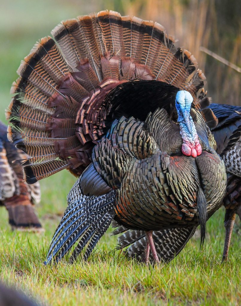 The eastern wild turkey is known for its chestnut-brown tail feather tips. They have both black and white wing bars and have the longest beards of all subspecies of wild turkeys. Adult males weigh 18 to 30 pounds and adult females can weigh 8 to 12 pounds. Easterns are also known for having the loudest gobble of all the subspecies.