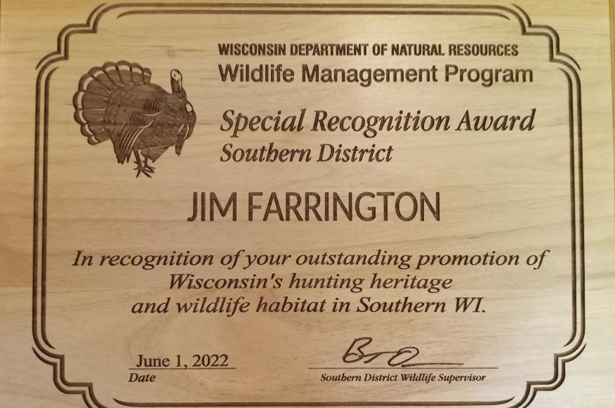 “Passionate volunteers like Jim are the lifeblood of the NWTF,” NWTF co-CEO Kurt Dyroff said. “We are proud to see him honored by the WDNR for his immense conservation legacy.”