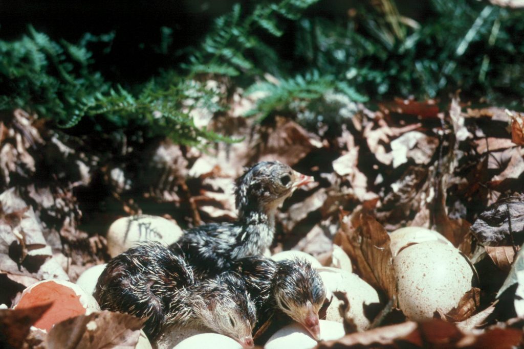 Wild turkey poults are precocial. They are born with natal down, can function and are active. That’s unlike most songbird hatchlings, which are altricial, or almost helpless. Newborn poults have a yolk sac that provides some nourishment. But they are soon underway with the brood hen. Oddly, young poults exhibit some behaviors such as strutting very early in life.