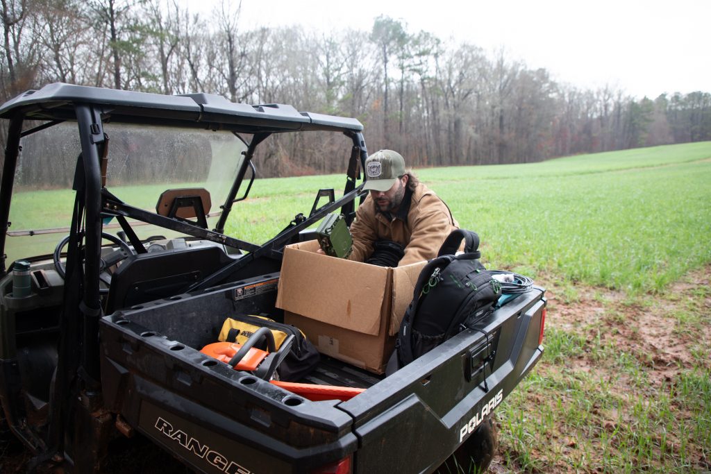 Wightman was accompanied by Nick Gulotta, postdoctoral researcher at the Warnell School of Forestry and Natural Resources. Each hopped in a UTV loaded with ARUs, tools, mics, a tree-climber stand and hundreds of feet of analog audio cable.