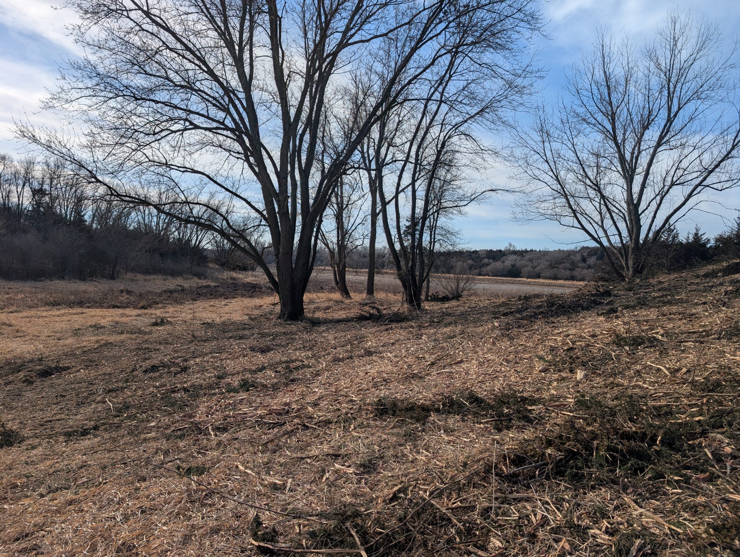 A contractor cut and mulched cedar trees that were crowding out native grasses and forbs. As Eastern red cedar spreads across the region, it shrinks open spaces that wildlife rely on and limits growth of plants that provide food and cover. These trees can use up to 50 gallons of water per day, reducing availability for nearby streams, wetlands and surrounding vegetation.